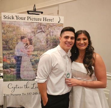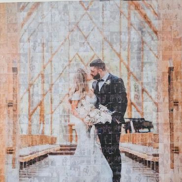 Photos and selfies taken during your event are printed on 2x2 tiles and pieced together on an art board to create a beautiful final mosaic for the bride and groom to take home!